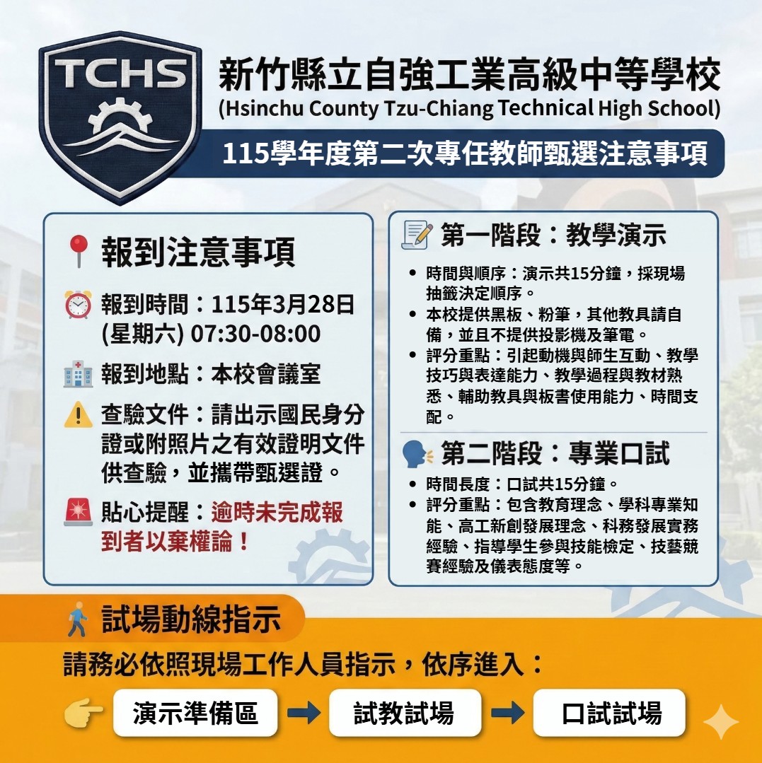 公告本校第二次專任教師甄選應試名單、試場配置及甄選注意事項